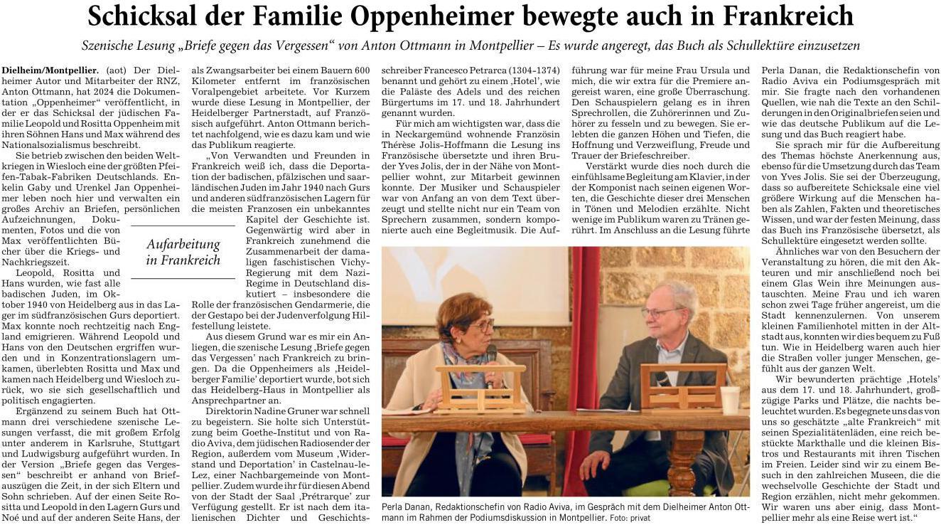 Dielheim-Montpellier."Der Dielheimer Autor und Mitarbeiter der RNZ, Anton Ottmann, hat 2024 die Dokumentation "Oppenheimer" veröffentlicht, in der er das Schicksal der judischen Familie Rosita und Leopold Oppenheim mit ihren Sönen Hans und Max während des Nationalsozialismus beschreibt". ..."